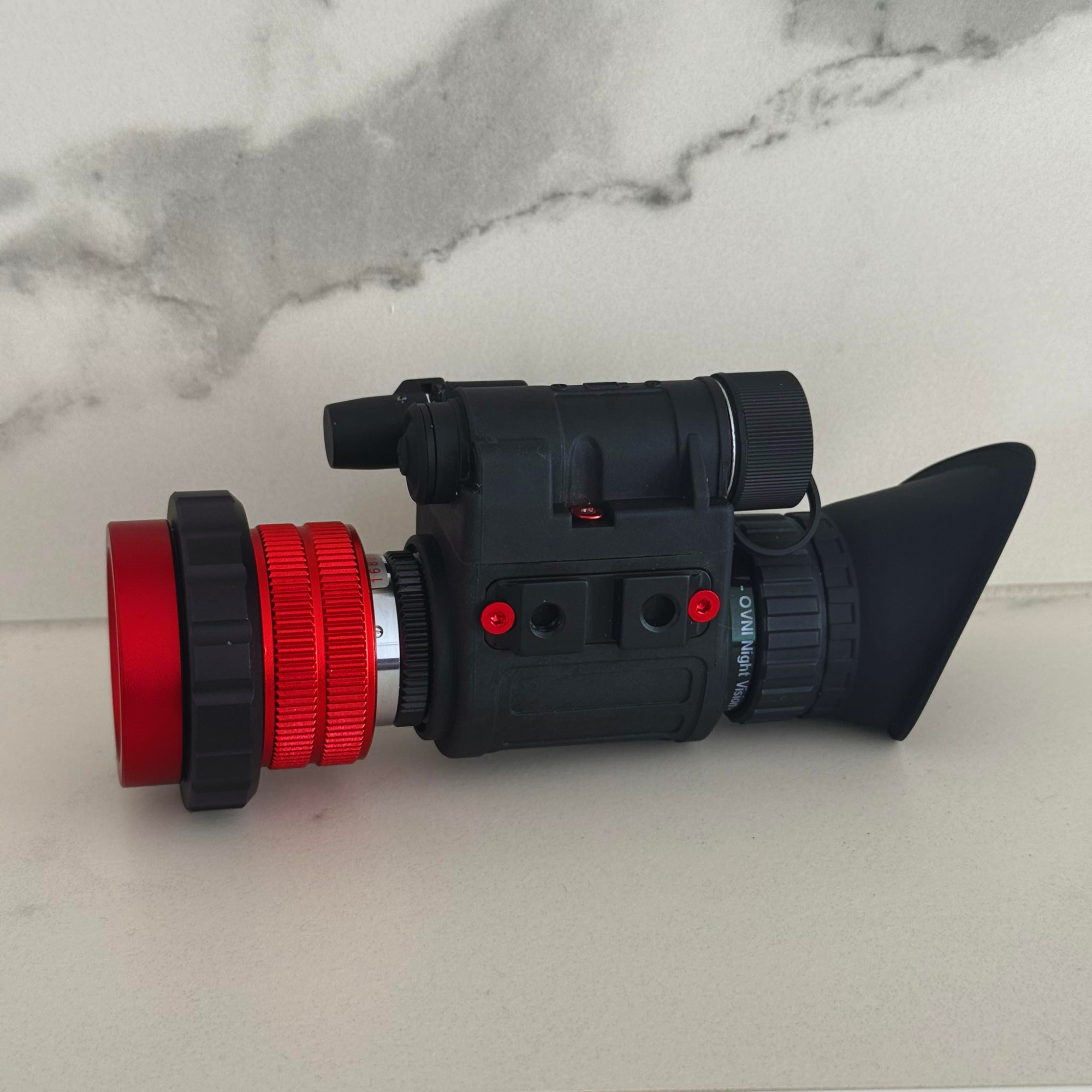 Fabriqué en France l'OVNI-M PRO intègre un tube intensificateur « Astronomy Grade » qui est une des nombreuses innovations OVNI Night Vision (en savoir plus). Comme avec tout oculaire, il s'utilise directement au foyer grâce à son coulant 31,75mm (avec filetage pour filtres) de n'importe quel télescope ou lunette d'astronomie. Très polyvalent, il est même possible de l'utiliser en afocal, c'est à dire sur un oculaire traditionnel agissant ainsi comme un réducteur de focal (voir galerie photos ci-dessous). Ainsi l'observation du ciel profond à très grand champ devient possible. A l'inverse on peut par exemple lui associer une barlow pour augmenter le grossissement. Sans oublier de l'utiliser à la main (comme une paire de jumelles), avec la possibilité d'y ajouter des objectifs photo. L'OVNI-M PRO dispose ainsi de fonctions indispensables à l'astronomie comme l'autogated, le contrôle manuel du gain et un tube phosphore blanc (couleur très naturelle).